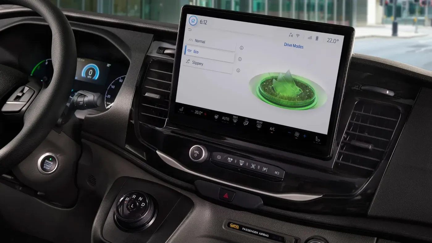 Přizpůsobte způsob jízdy vašeho E-Transitu s třemi možnostmi jízdních režimů. Každý z režimů upravuje různá nastavení vozidla tak, aby optimalizoval výkon pro zvolené podmínky. Režim Normální je ideální pro každodenní ježdění, režim Kluzký povrch vylepšuje řízení v mokru nebo na ledu a režim EKO umožňuje vydat to nejlepší z akumulátoru.