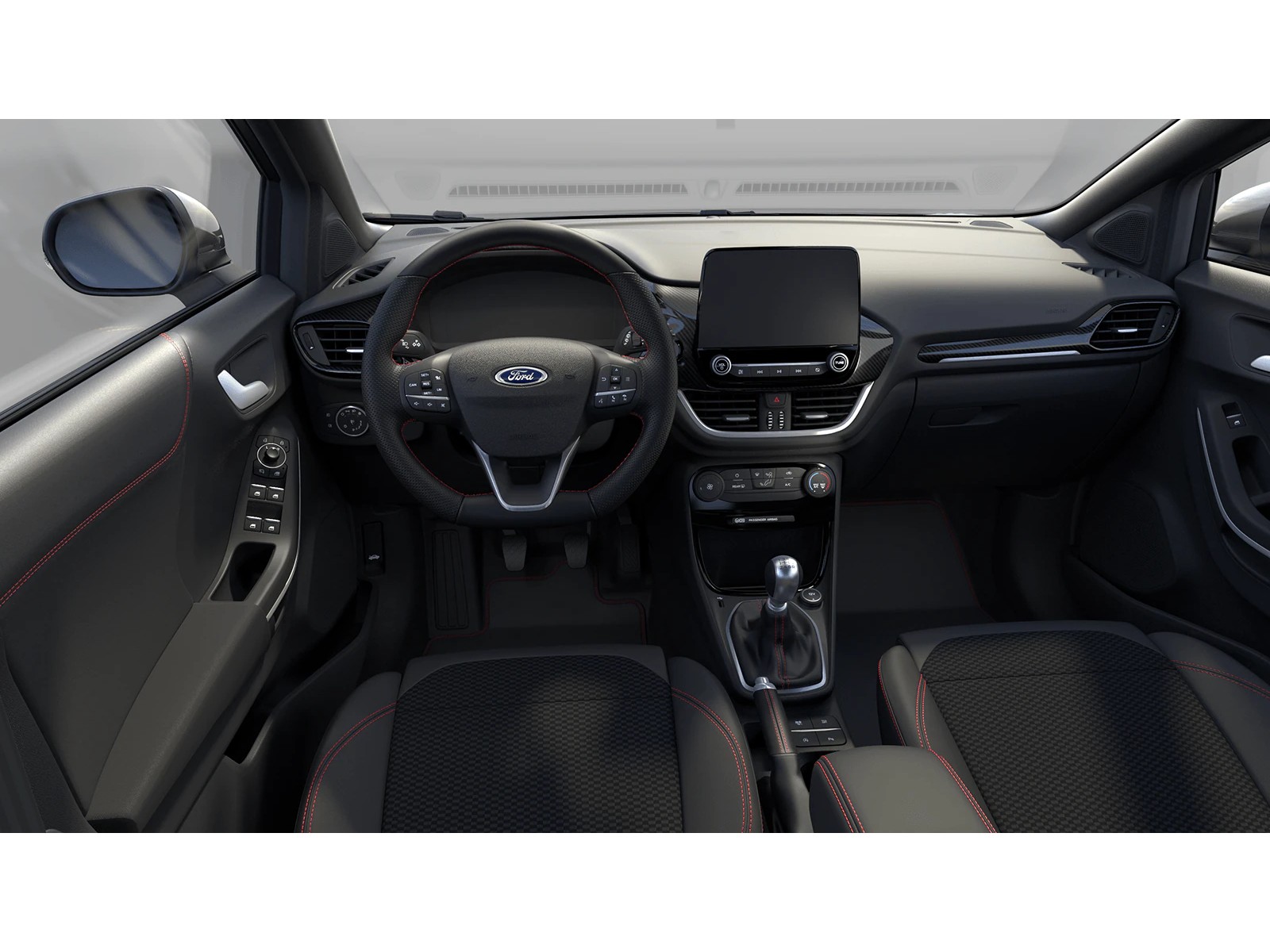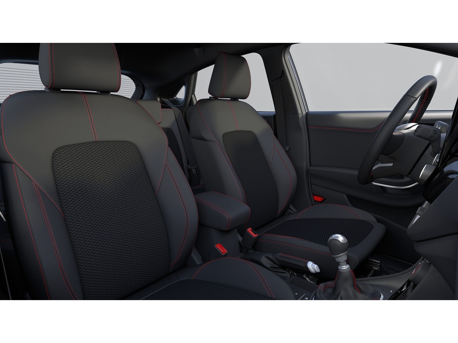 - Sedadla čalouněná v prémiové kombinaci vinyl/ NeoSuede s červeným prošíváním